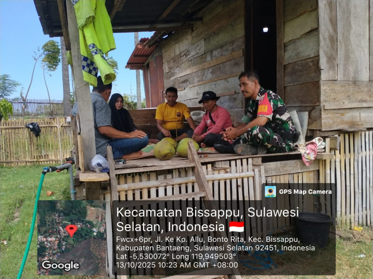 BANTAENG — Babinsa Kelurahan Bonto Rita, Koramil 1410-01/Bissappu, Serma Syamsuddin, melaksanakan kegiatan Komunikasi Sosial (Komsos) bersama petani padi Sdr. Supriyadi yang didampingi oleh Ketua PPL Sdr. Hamsah, bertempat di Kampung Kayu Lompoa, Kelurahan Bonto Rita, Kecamatan Bissappu, Kabupaten Bantaeng. Senin (13/10/2025).