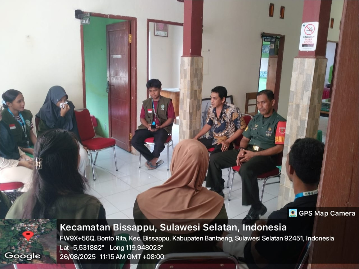 Bantaeng – Babinsa Kelurahan Bonto Rita, Koramil 1410-01/Bissappu, Serma Syamsuddin, bersama Lurah Bonto Rita melaksanakan kegiatan Komunikasi Sosial (Komsos) dengan mahasiswa Kuliah Kerja Nyata (KKN) Universitas Megarezky Makassar. Kegiatan tersebut berlangsung di Kantor Lurah Bonto Rita, Kecamatan Bissappu, Kabupaten Bantaeng, Selasa (26/8/2025).