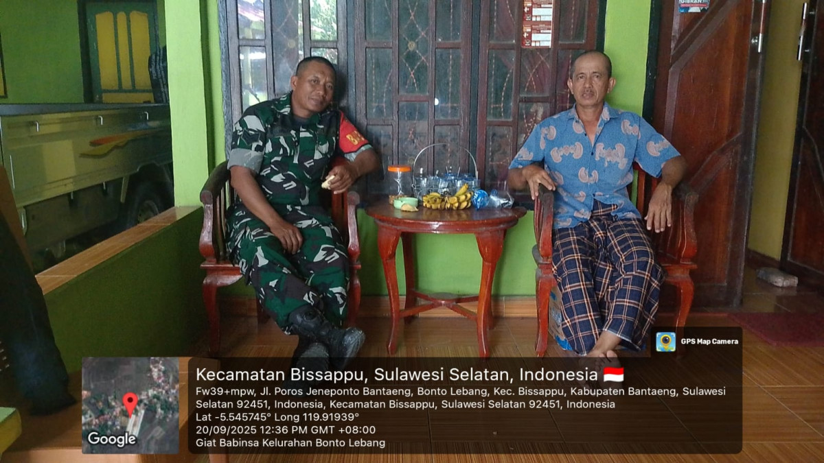 Bantaeng – Babinsa Kelurahan Bonto Lebang, Koramil 1410-01/Bissappu, Serka Abd. Rahman, melaksanakan komunikasi sosial (Komsos) bersama Ketua RW, Bapak Abd. Halim, bertempat di Beloparang, Kelurahan Bonto Lebang, Kecamatan Bissappu, Kabupaten Bantaeng. Sabtu (20/9/2025)